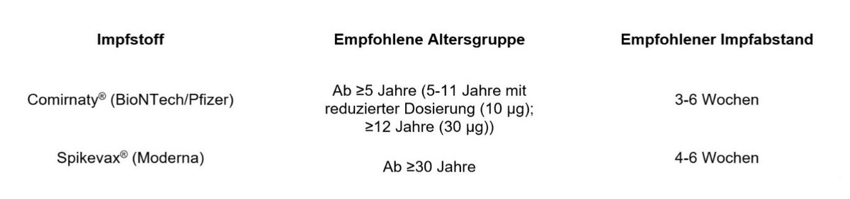 - Die Grundimmunisierung soll mit zwei Dosen des COVID-19 mRNA-Impfstoffs Comirnaty (BioNTech/ Pfizer) erfolgen.
