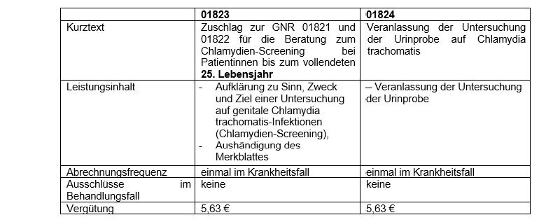 Die Besonderheit beim Chlamydien-Screening ist, dass die Leistungen nach GNR 01824 nur berechnet und vergütet werden, wenn bei mindestens 50% der Patientinnen mit einer Beratung zum Chlamydien-Screening (GNR 01823) anschließend auch eine entsprechende Urinuntersuchung veranlasst wird.